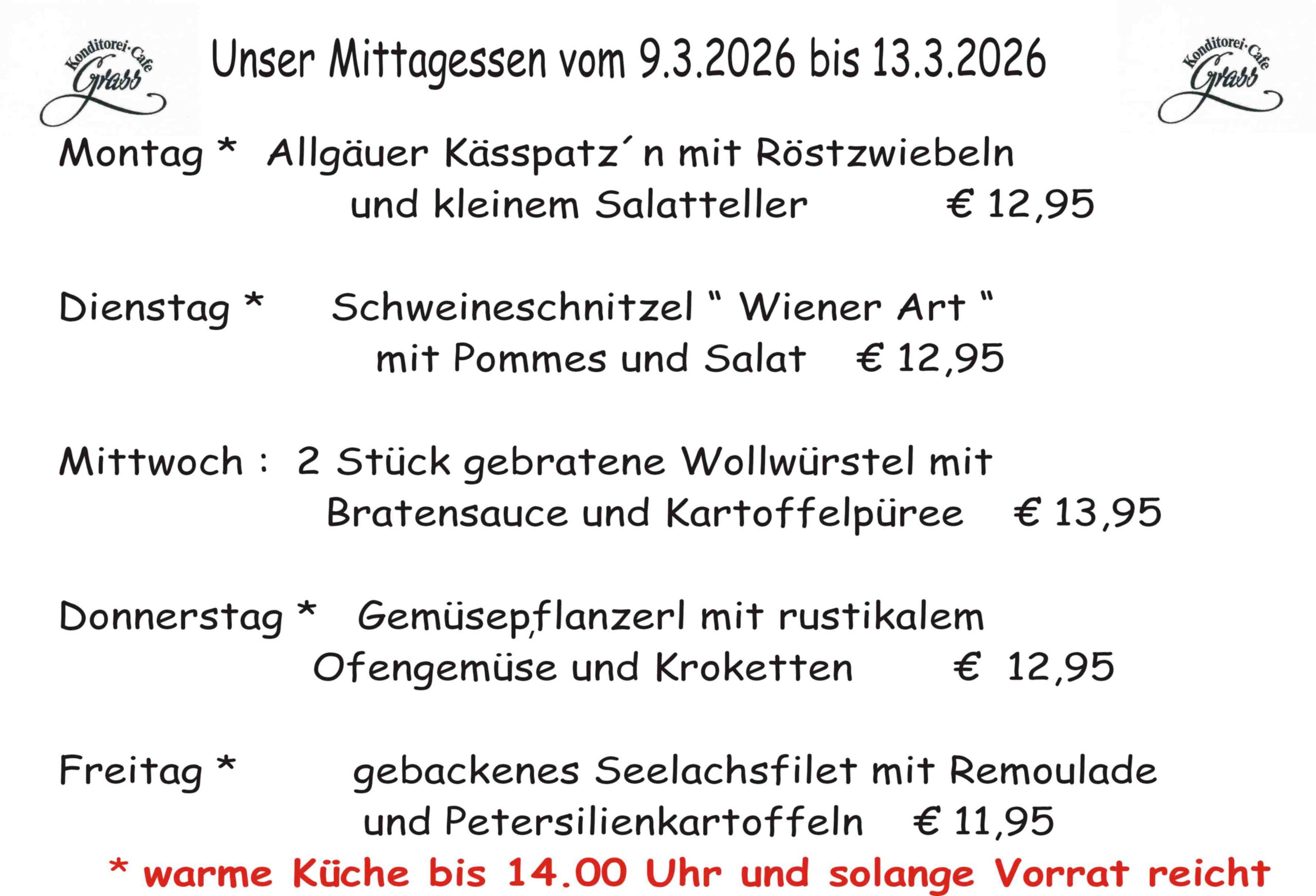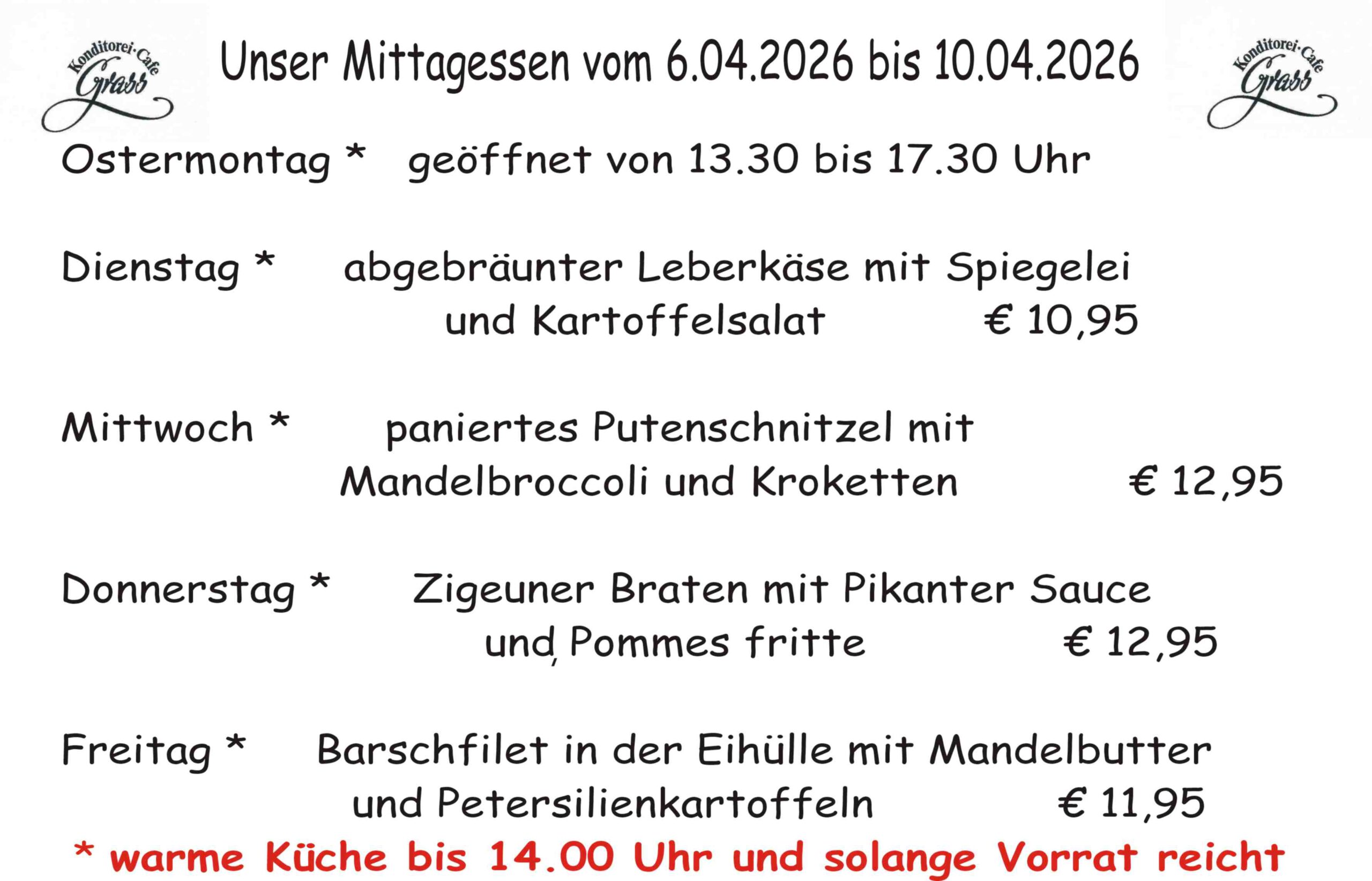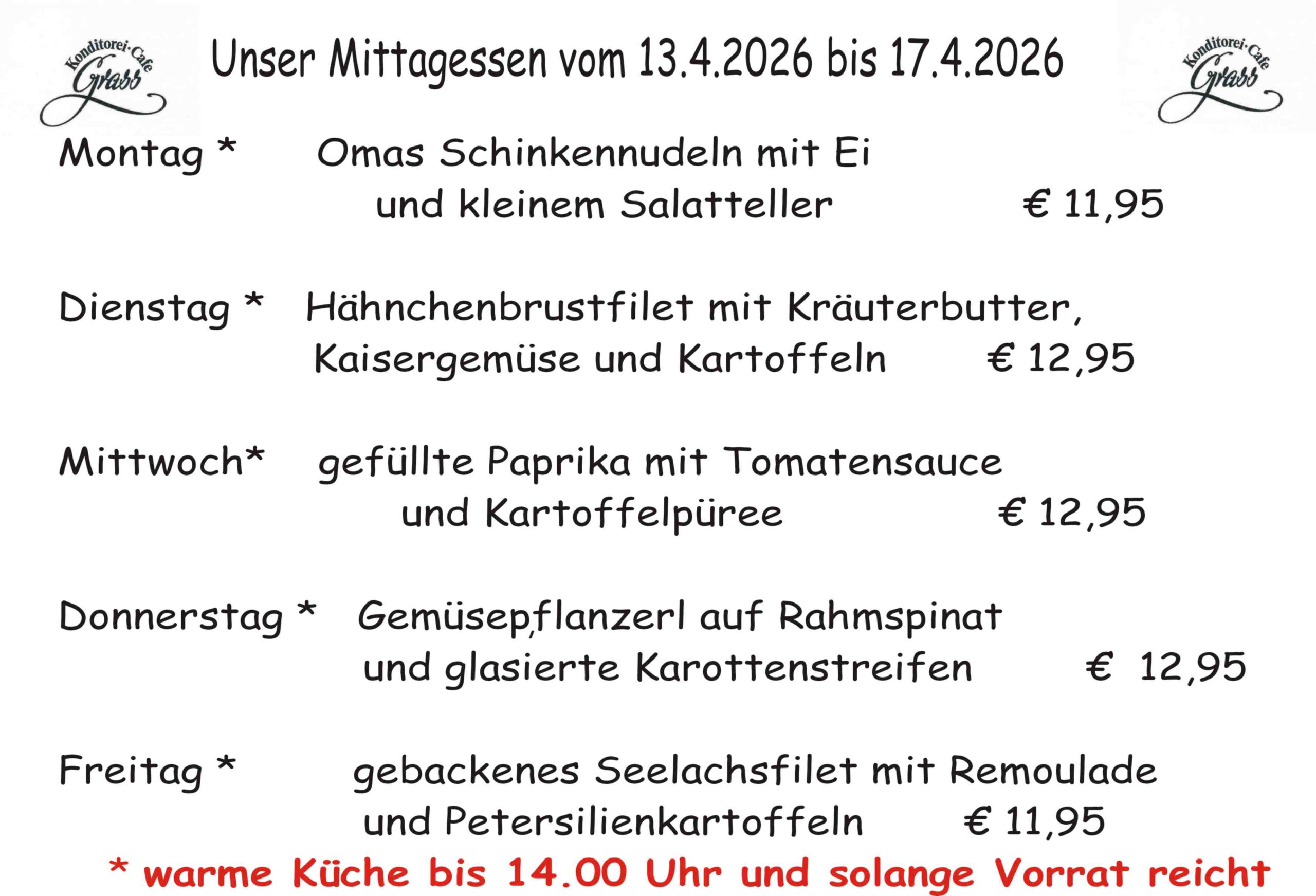 Auf unserer Tageskarte finden Sie ein täglich frisch zubereitetes Mitagessen. Natürlich darf auch eine klassische Snackkarte für den kleinen Hunger nicht fehlen. Mit einem Klick wissen Sie, was es Mittags gibt
